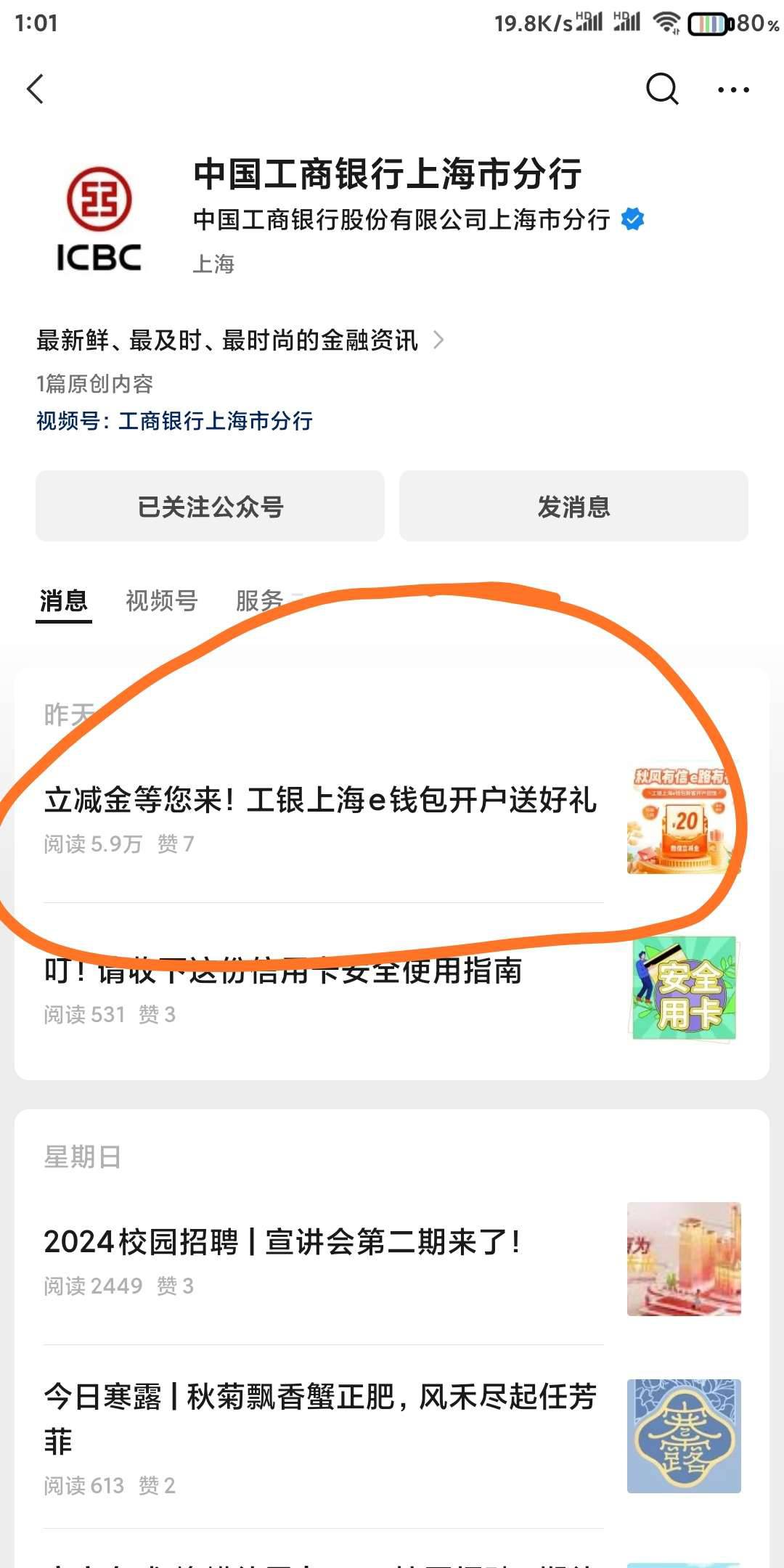 微信搜索工商上海分行,顶部文章开户 可领20立减金