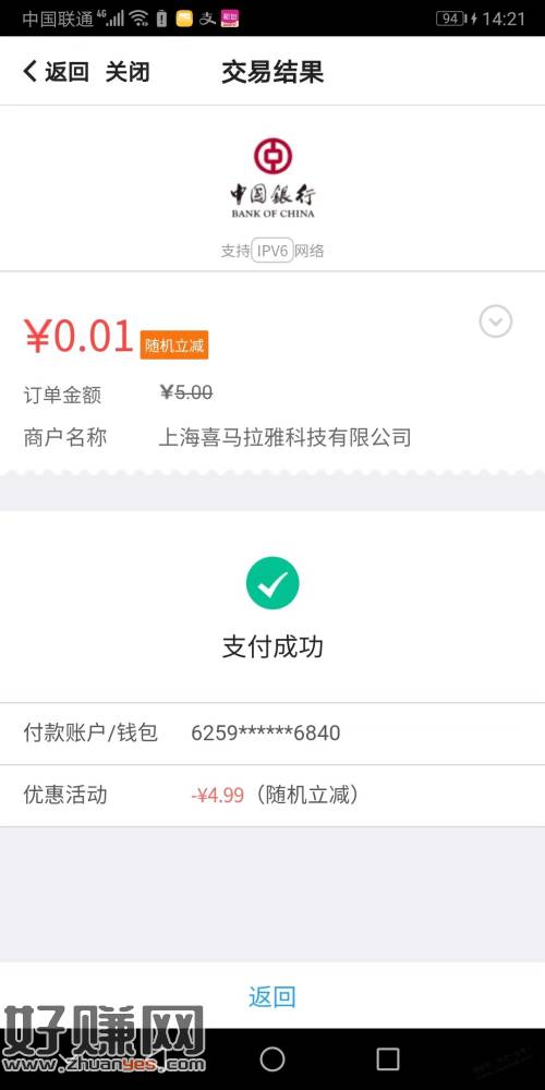 喜马拉雅,我的钱包,我的喜点,选择其他金额,输入5跳转中行app,上面显示随机立减,但实际扣款为一分钱,一月一次