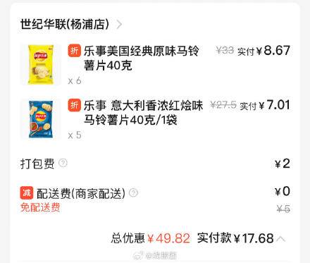 部分地区,饿了么有便利店59-20,薯片有满减,叠加后如图