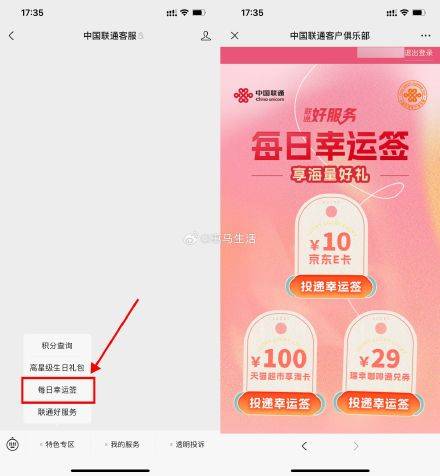 【联通幸运签抽京东E卡或瑞幸券】微信关注公众号“中国联通客服”->菜单栏“特色专区-每日幸运签”->每天1次机会抽10元京东E卡或29元瑞幸咖啡券