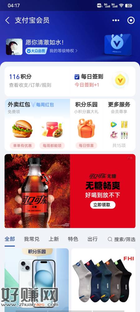 支付宝会员中心 领取2元可口可乐无糖代金券 需要领 美宜佳可