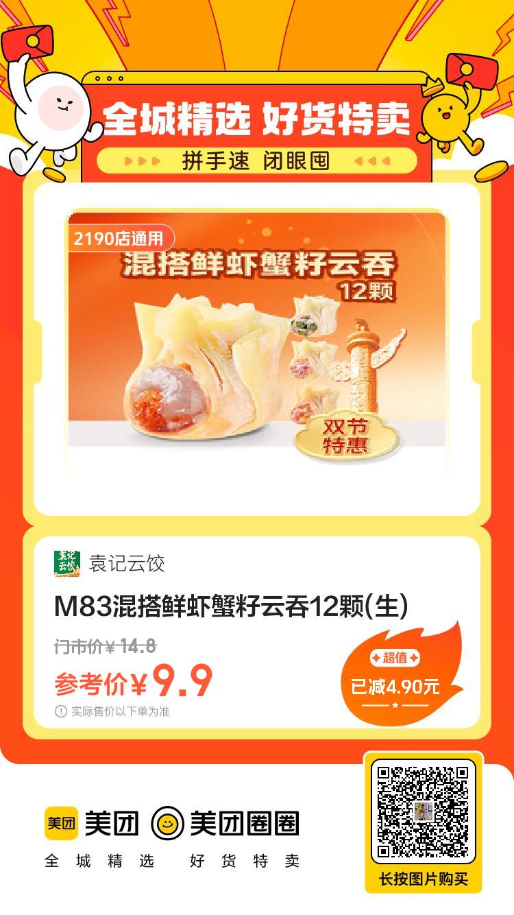 美团到店,9.9,袁记云饺|M83混搭鲜虾蟹籽云吞12颗
