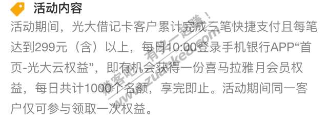 【权益服务】尊敬的客户:您已累计完成三笔快捷支付且每笔达到299元(含),获得一份喜马拉雅月会员,现可登录光大手机银行-生活-超值权益或现打开链接