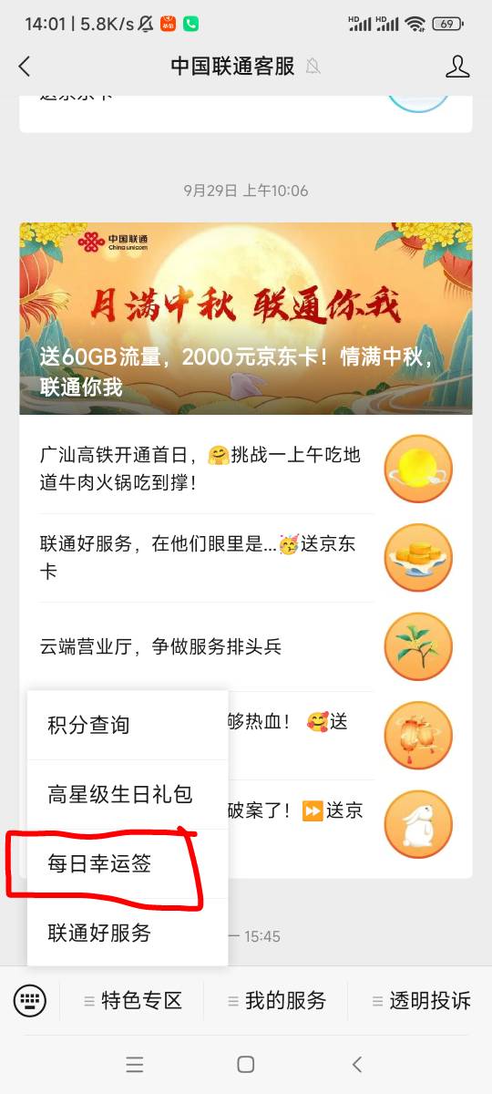 中国联通客服公众号-特色专区-每日幸运签抽奖
