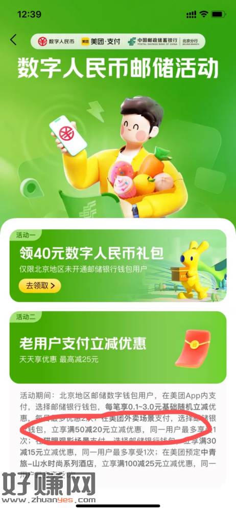 刚用美团点外卖发现的,用邮储数币支付50-20