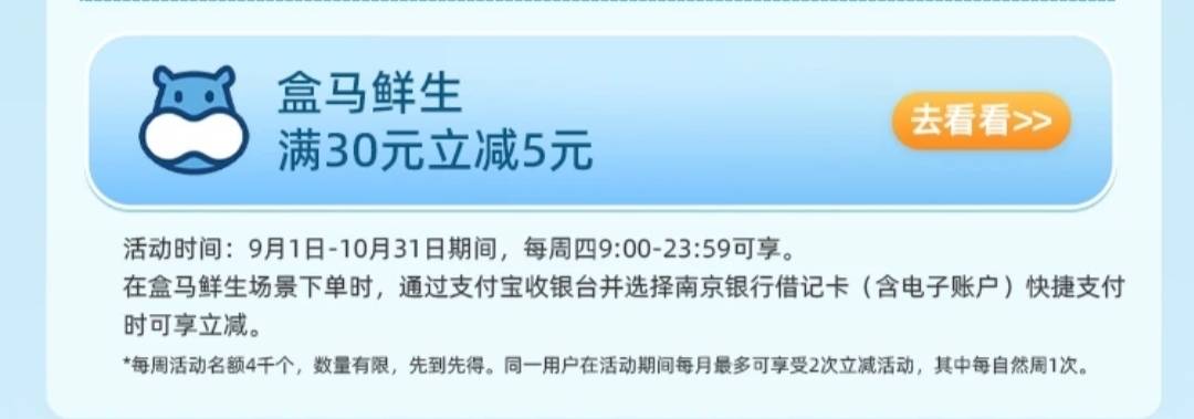 南京银行盒马50-5 盒马鲜生APP搜:礼品卡,买50的南京银行储蓄卡支付(含电子户)立减5元实付45,价值46.5元 周一次,10月31截止!