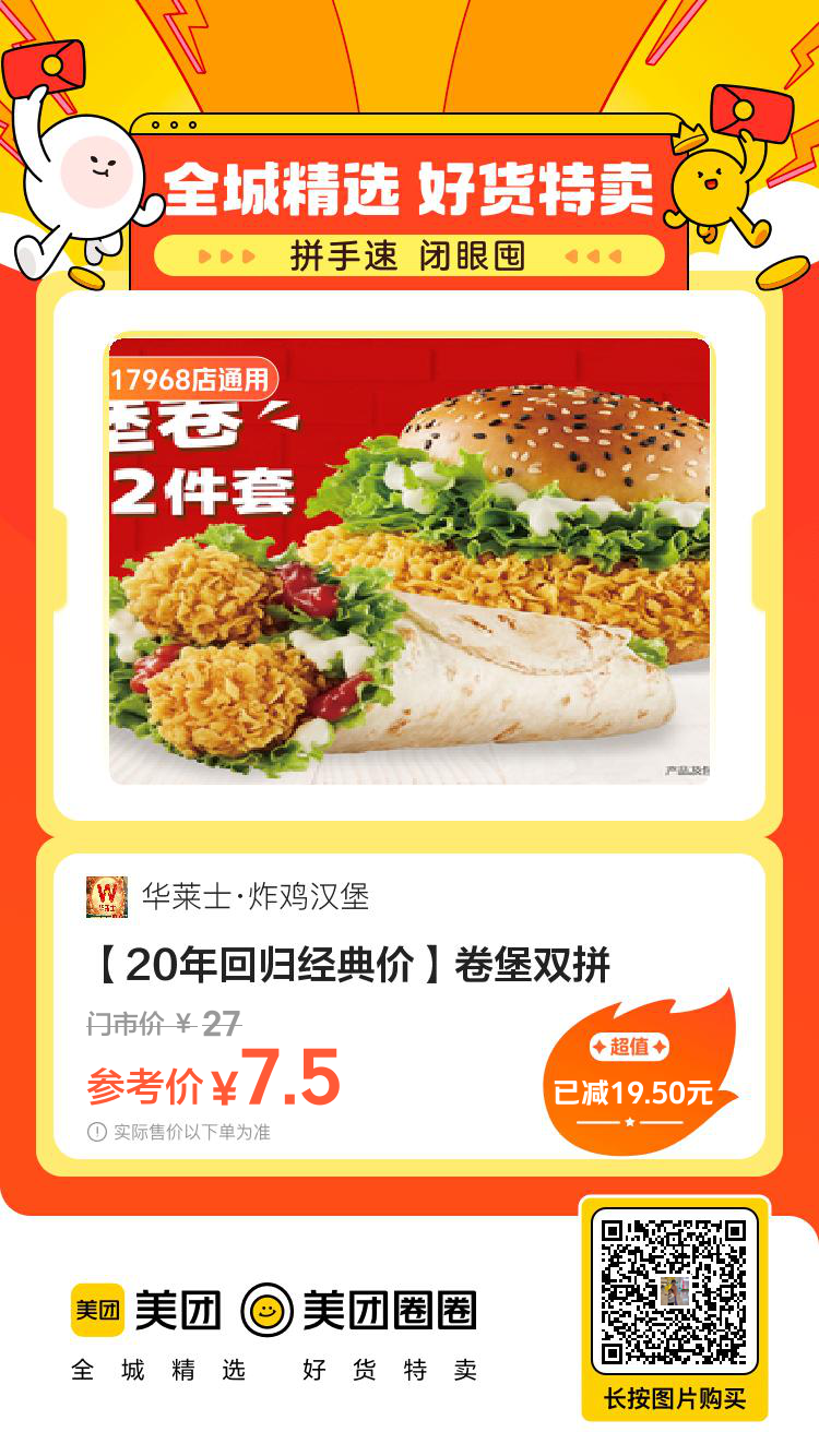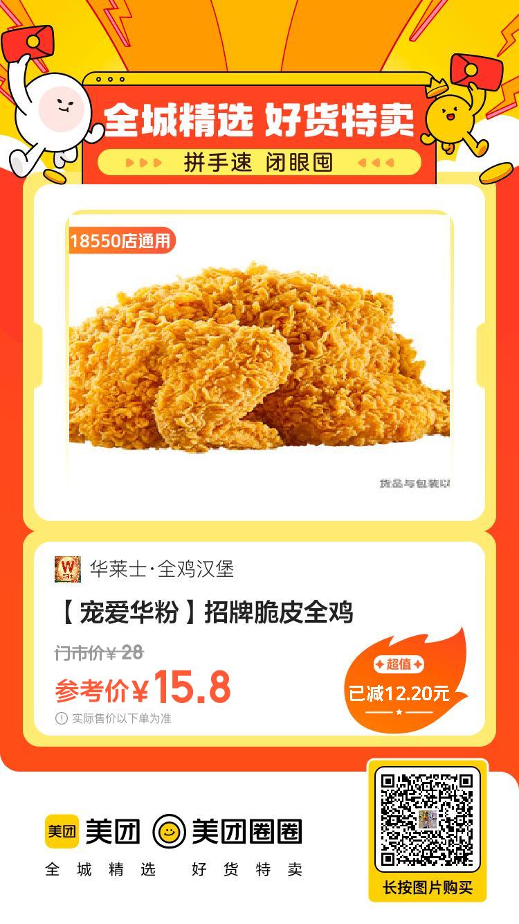 美团圈圈 华莱士鸡肉卷+鸡腿堡7.5r 华莱士脆皮全鸡15.8r