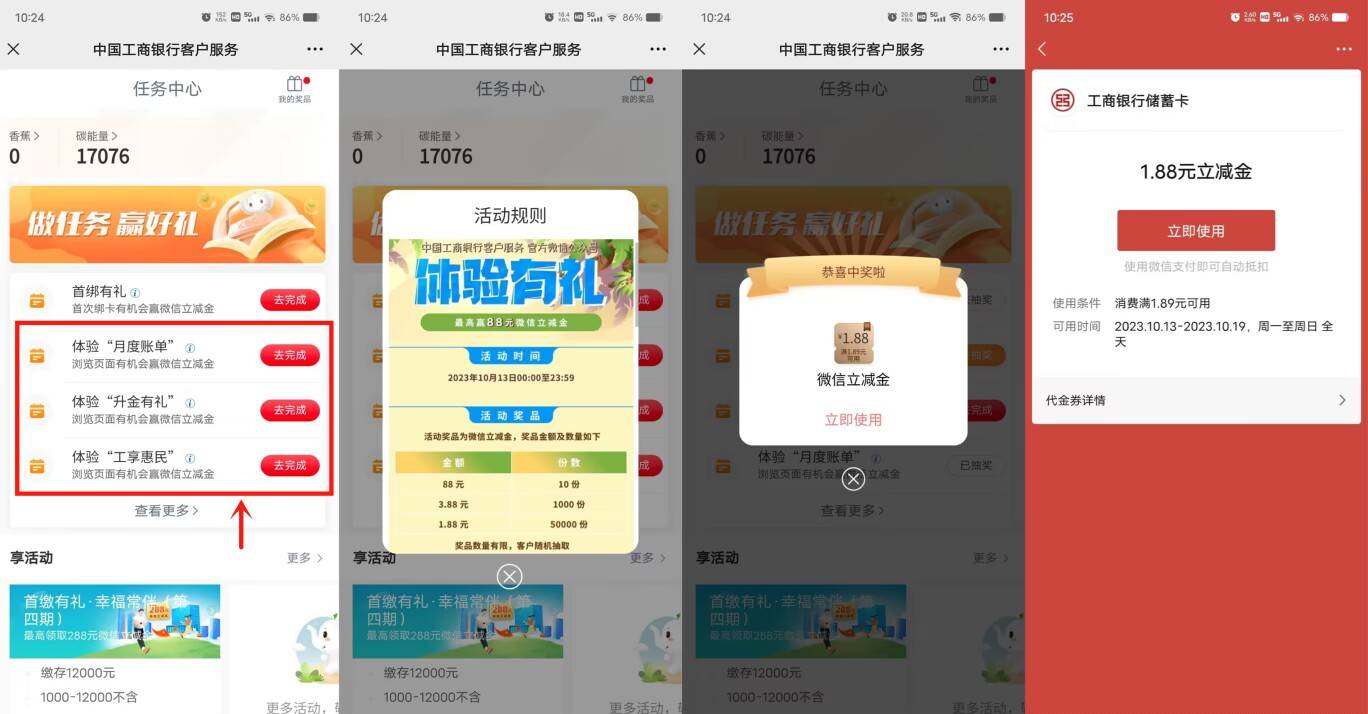 【工行微信抽1.88-88元微信立减金】新一期,关注微信公众号“中国工商银行客户服务”点菜单栏“服务”-“任务中心”进去,完成3个浏览任务可以抽奖3次,工行微信的活动需要在公众号里绑定任意一张工行卡才可以参加,刚中1.88元,非必中