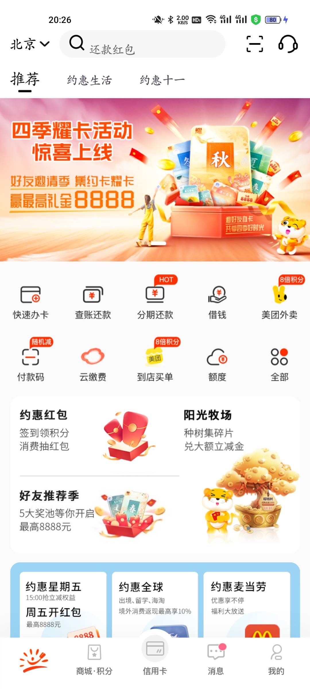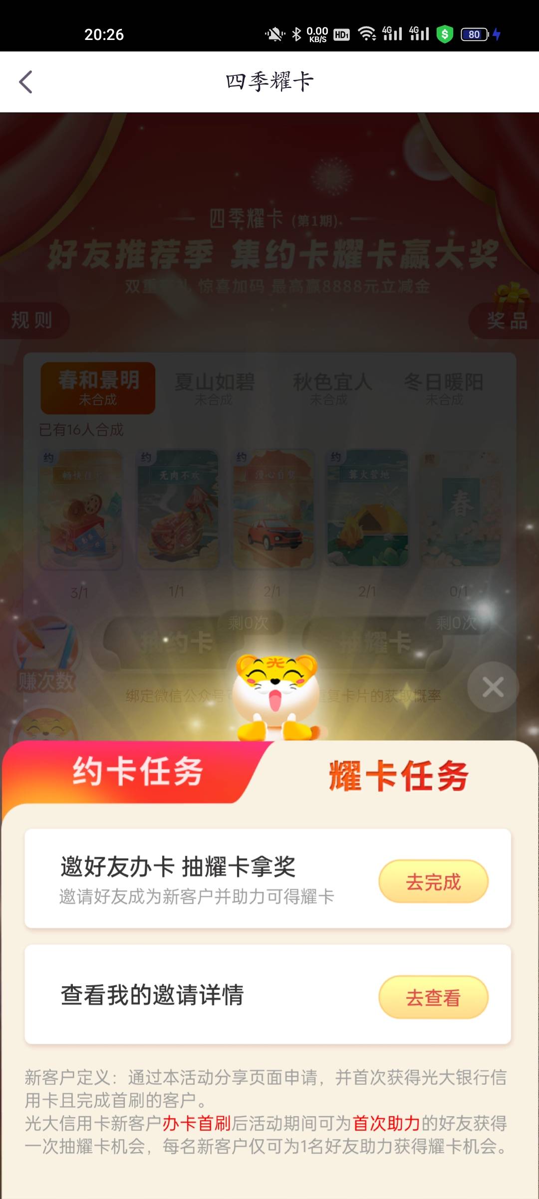 阳光惠生活首页横幅四季耀卡活动,集卡抽最低50立减金,要有光大信用卡才能参与,约卡日常签到就能抽,耀卡需要拉人办卡,有闲钱的老哥可以去放单搞