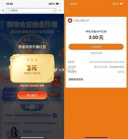 新一期!支付宝APP->搜索“木兰日”->做任务得次数->抽到天猫荭包或猫超卡才有用!