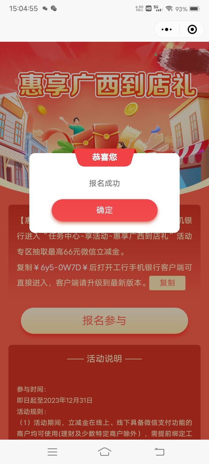 首发,之前工行飞了广西防城港的,有广西工行卡的。 微小程序工行服务,定位防城港中山支行,然后点惠享广西到店礼,报名,然后复制那个码打开工行APP或者直接去工行APP任务中心底下惠享广西到店礼抽奖。我抽了16.8,最高66 立减金限卡,看图。写了5张,还没测试能不能多号。
