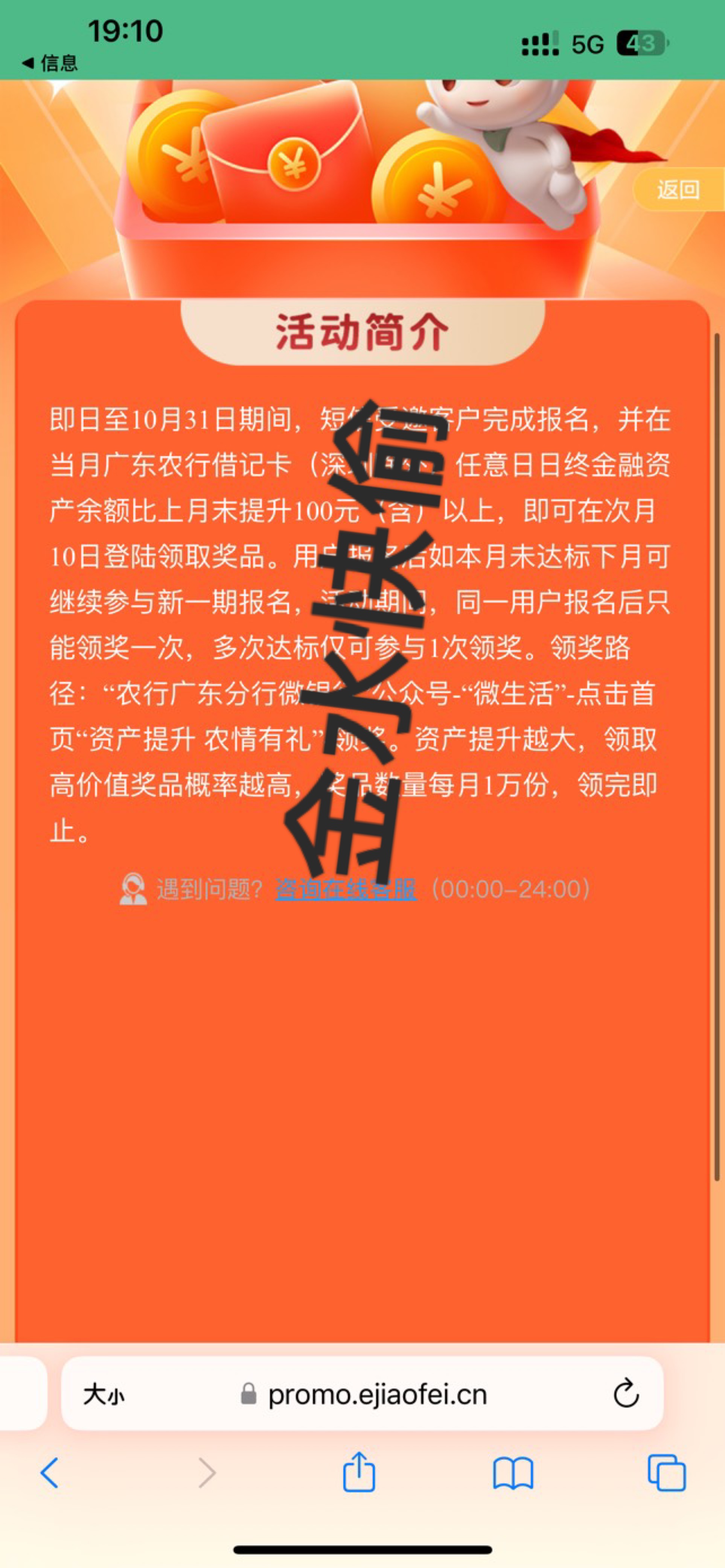 农行广东公众号-微生活-资产提升农情有礼,广州农行特邀100块钱放卡里面一天,下个月10号抽奖,积分1比一兑换奖品 也就是说 你上个月卡里最高有500块钱 在这个500的基础上加100 放一天视为合格