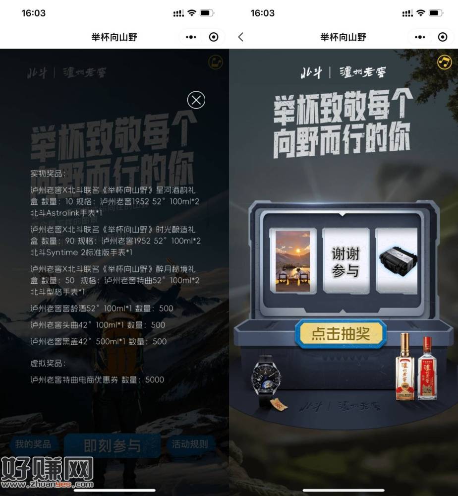 【泸州老窖北斗抽免费小酒实物】微信进入小程序“举杯向山野”->随便点下得次数,只有抽中实物才有用