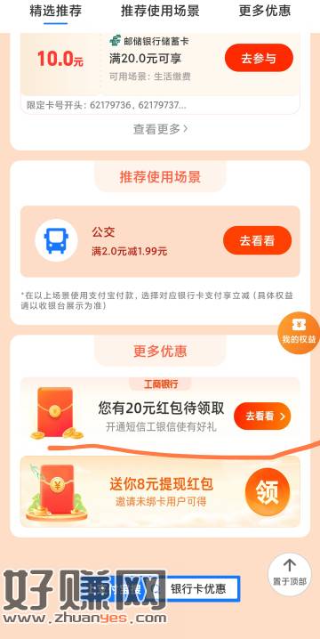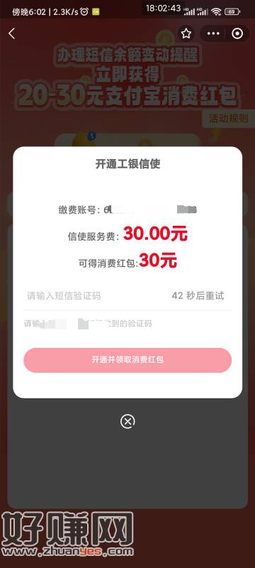 zfb搜银行卡有优惠 下滑 开通工行短信提醒 开通费用30送