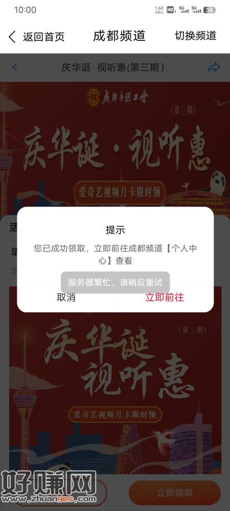 10点川工之家app 注册地选四川成都 设置也可以更改 进入app点击频道选成都可以领取一月爱奇艺 到账注册手机号