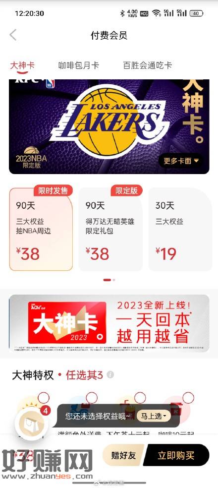 肯德基APP,卡券,点百神会,有张大神卡半价会员,可19开季卡