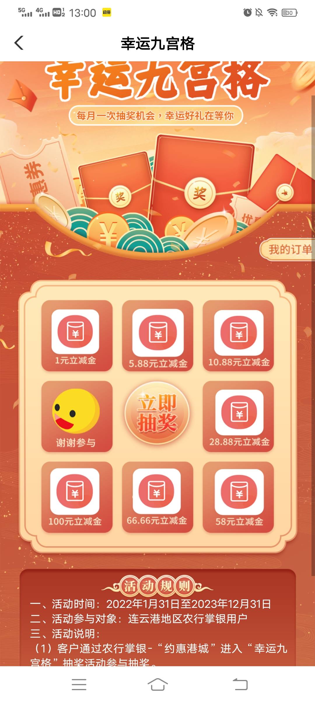 农行飞江苏连云港代码104311,去约惠港城幸运九宫格抽奖
