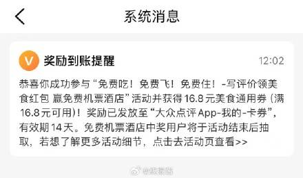 反馈,大众点评app,我的,待评价,顶部横幅的免费吃免费飞免费住,写4条100字评价,秒得16.8券