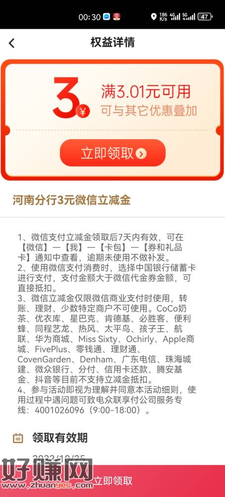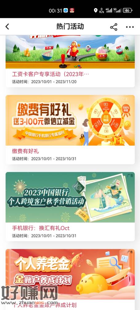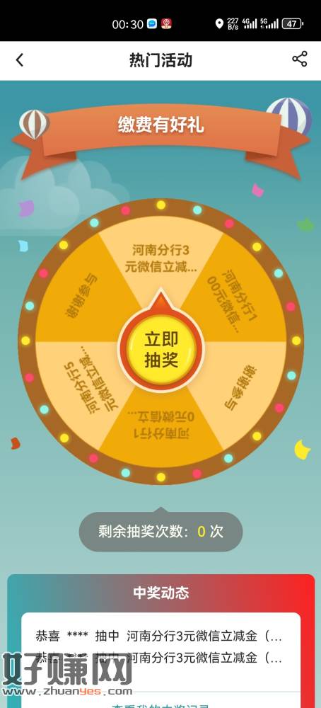 中行缴费有好礼缴费0.1元抽三元立减金。