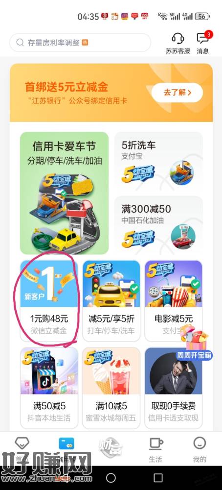 打开江苏银行App点xing/用卡点下面广告有个48元立减金,跳转微信用江苏银行xing/用卡付1元就能得立减金