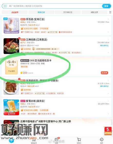 饿了么app首页下拉有200豆兑换吃货卡,估计看号