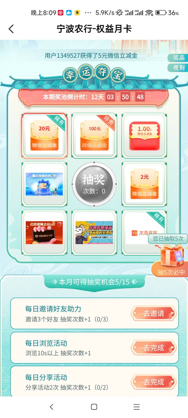 宁波农行城市专区权益月卡抽奖