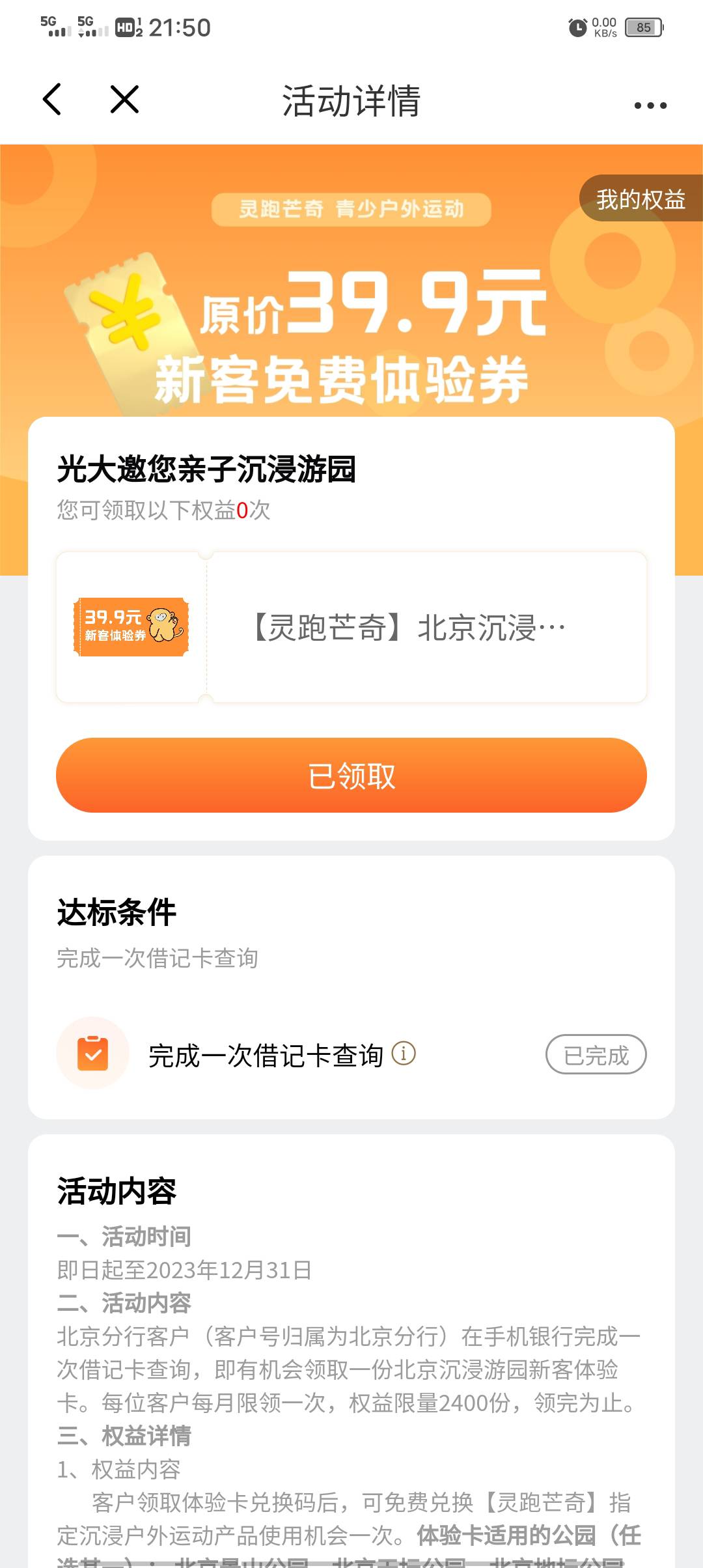 光大北京分行客户完成一次借记卡查询,不知道这个卷有没有用,领了再说,还有一千多份