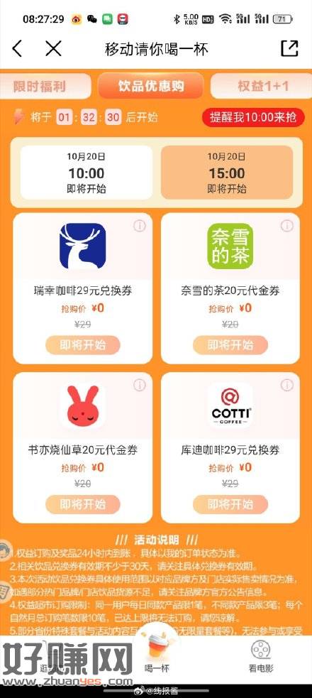 10点15点移动铂金可领瑞幸奈雪等