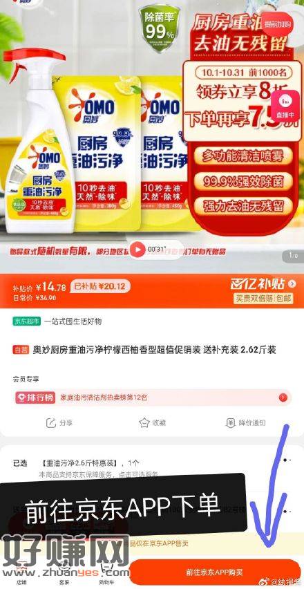 奥妙 厨房重油污净2.62斤,14.78元,送洗洁