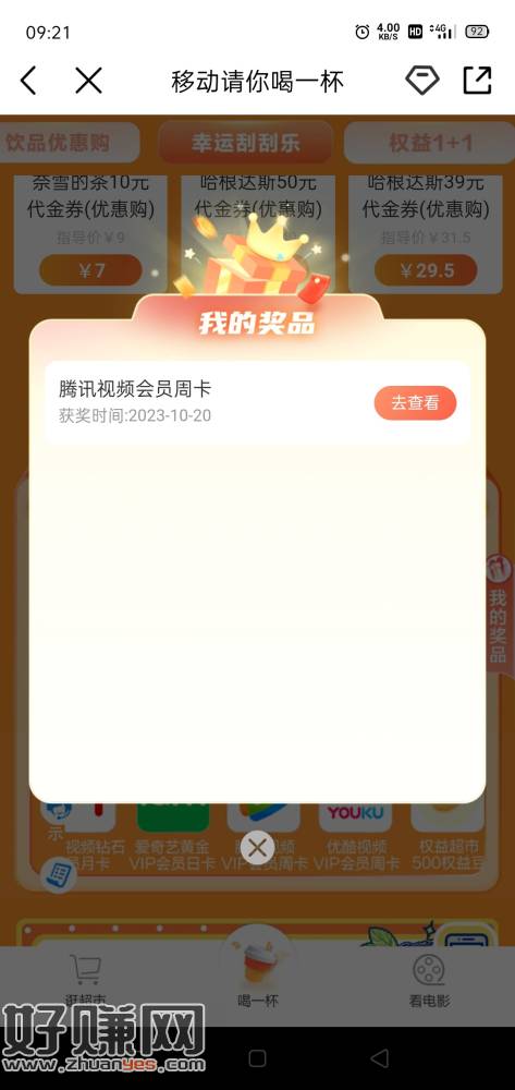 中国移动~权益~请你喝奶茶,10点开抢。页面下拉刮刮卡能划出会员