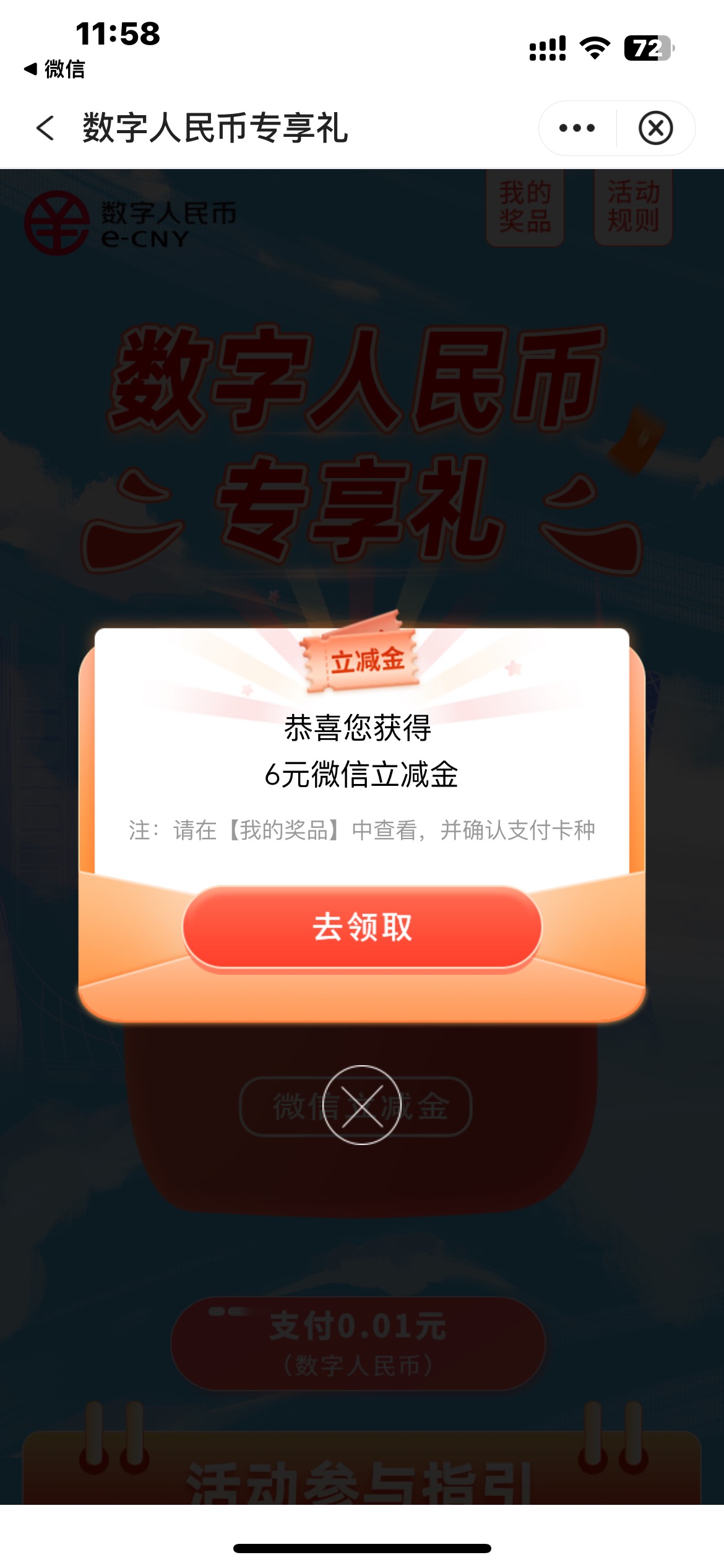 中行广东城市服务数币专享礼支付0.01抽奖,每月一次