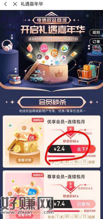 2.4元撸实物 翼支付-权益-横幅礼遇嘉年华 先开通2.4