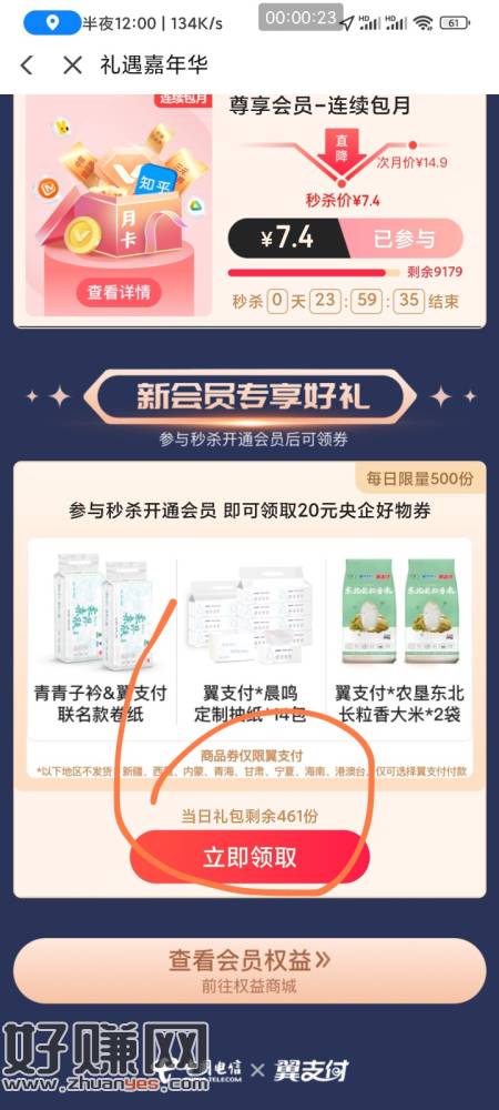 2.4元撸实物 翼支付-权益-横幅礼遇嘉年华 先开通2.4元的会员(还能领视频周卡或者5美团) 开完下滑领20代金券 点使用 最后一定要去解除代扣 不然下月还扣款反撸 数量有限,没券就等第二天0点补货