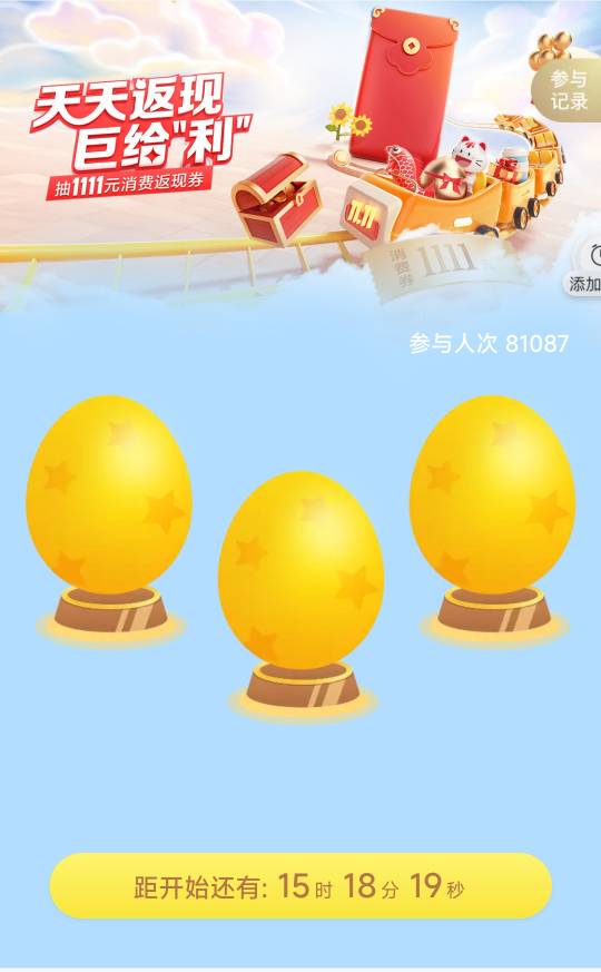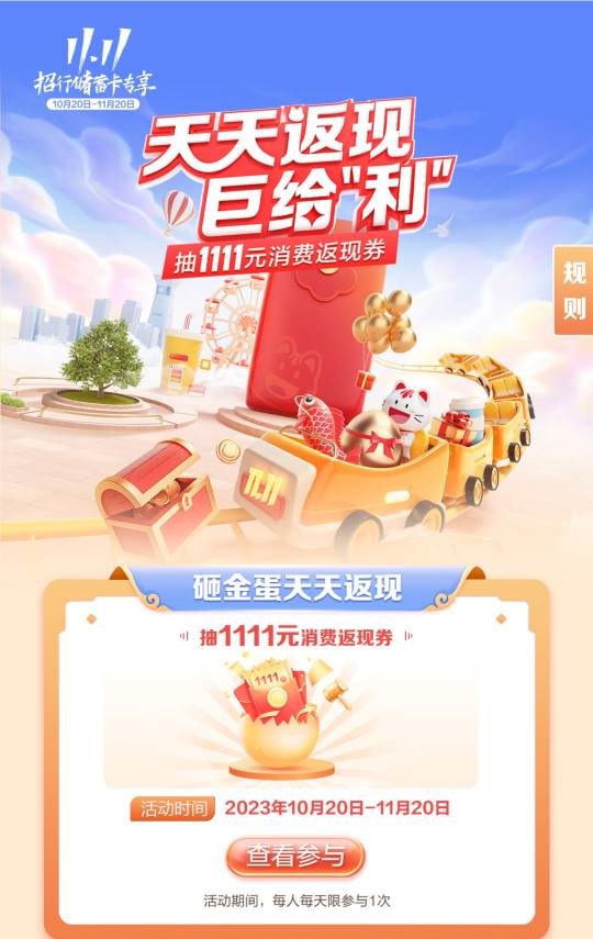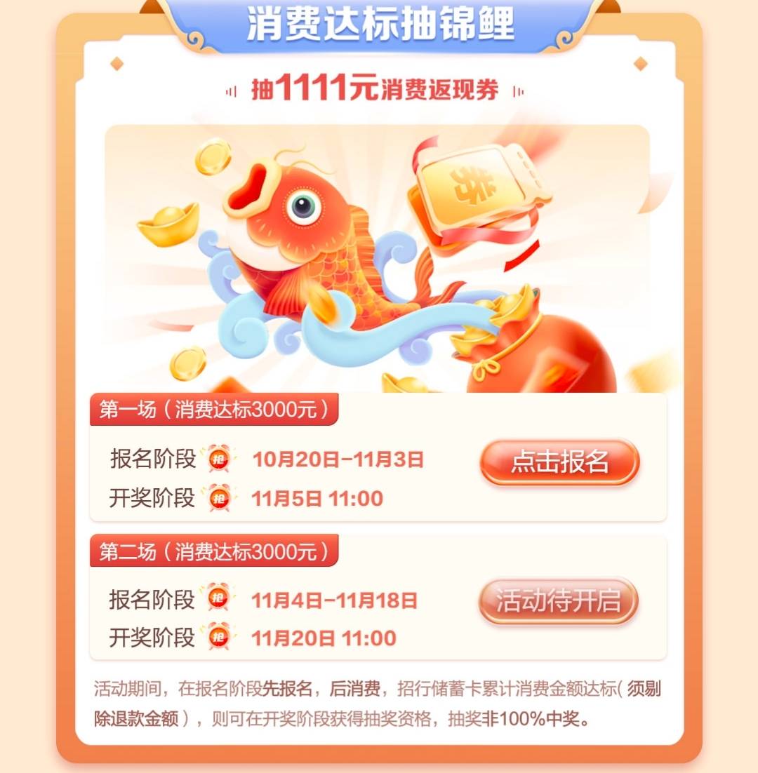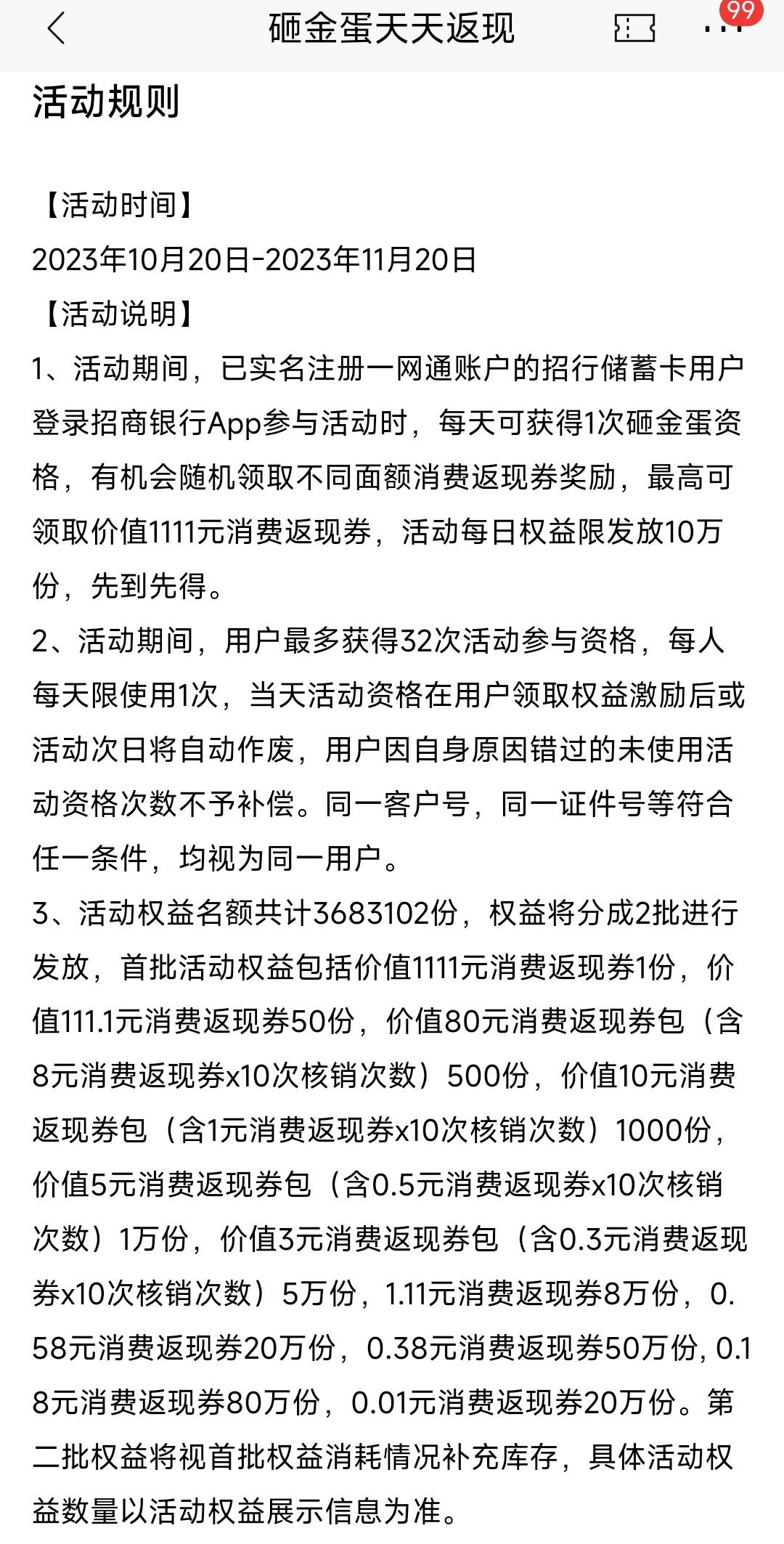 有2个活动 活动路径:招商银行APP搜:天天返现 01、第一个砸金蛋 砸中0.18以上,去支付宝余额宝/余利宝充值规定金额抵扣 抽中1分钱忽略即可 02、第二个消费达标抽锦鲤(非必中) 分2个阶段 先报名 后余额宝/余利宝通过招商储蓄卡充值3000,别的银行卡转出 规定时间前往抽奖,最高1111元返现券 非必中, 中了重复余额宝/余利宝操作