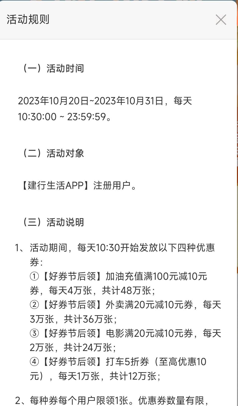 10点半建行生活10元外卖券 10点半,扫码 找到10元外卖券,跳转建行生活APP下拉去领取 活动期限一张