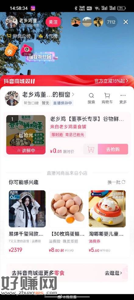 抖音老乡鸡董事长直播间有一分钱鸡蛋,感兴趣的蹲