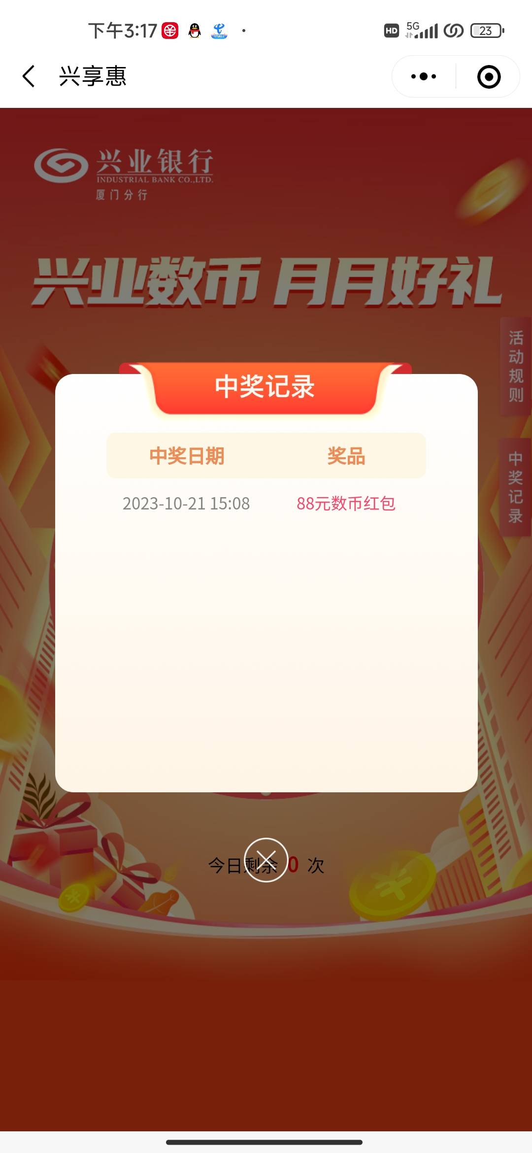 兴业上个月领过福州厦门记得抽奖 中了88通用数币 入口兴享惠gzh