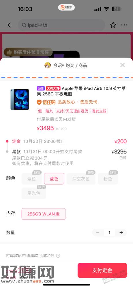快手预售商品中搜索iPad Air5,3495元,行情4500。