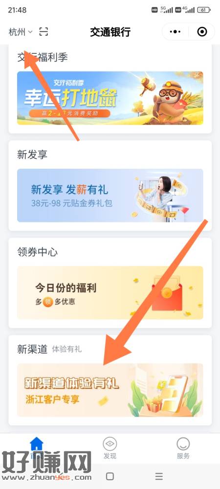 交通银行小程序-右上改杭州-下拉-新渠道体验礼