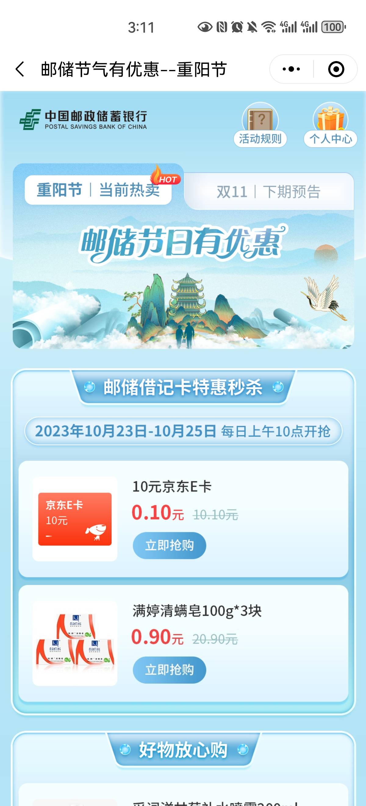 邮储好礼汇 重阳节活动23-25号 10点秒杀