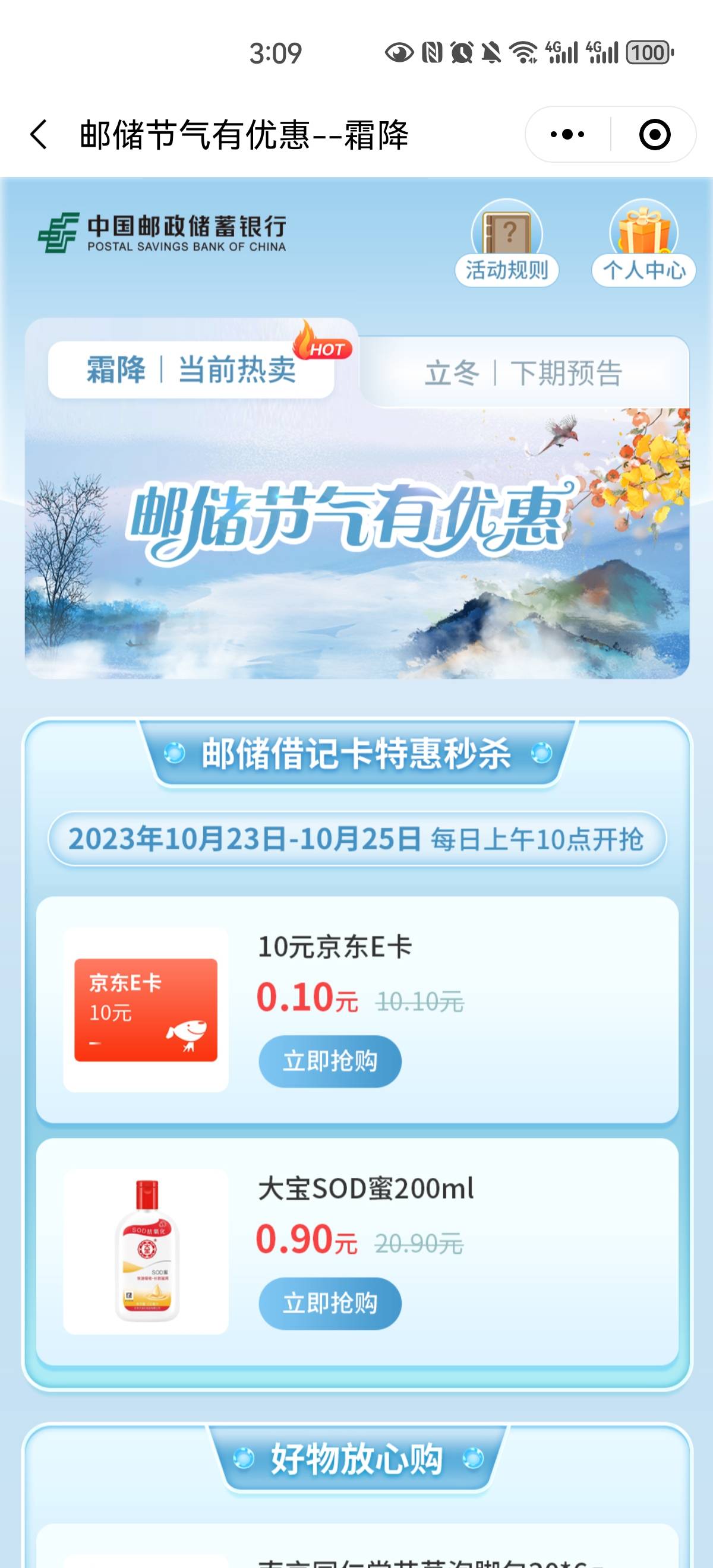 邮储好礼汇 霜降节气23—25号上午10点 0.1秒杀10e卡