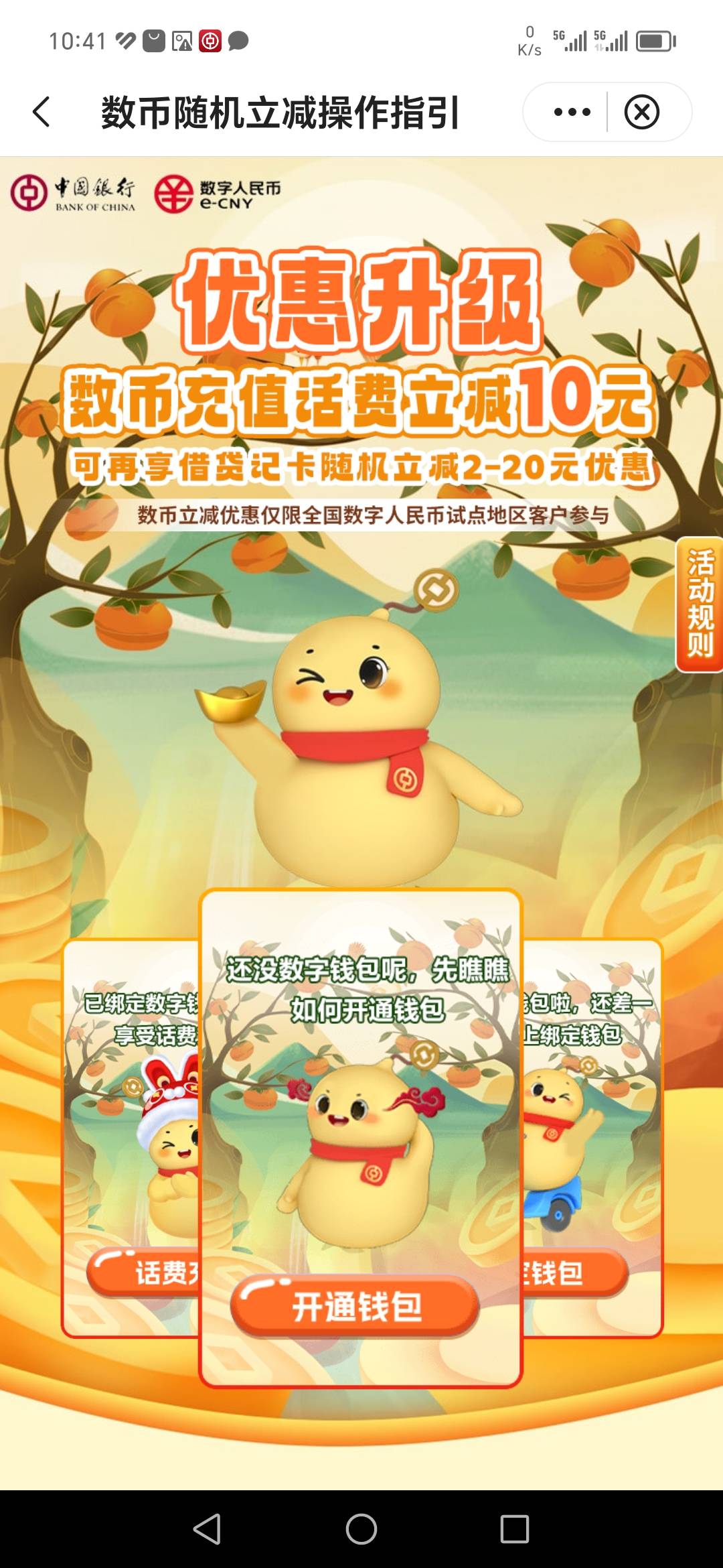 首发加精,中行app里面绑定自己的中行数币钱包,然后首页点击话费充值,选择数币支付立减10,可40冲50话费,利润7毛左右