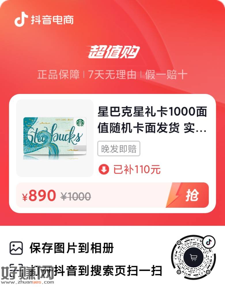抖音890买1000星巴克星礼卡 市场行情920 怕反撸的