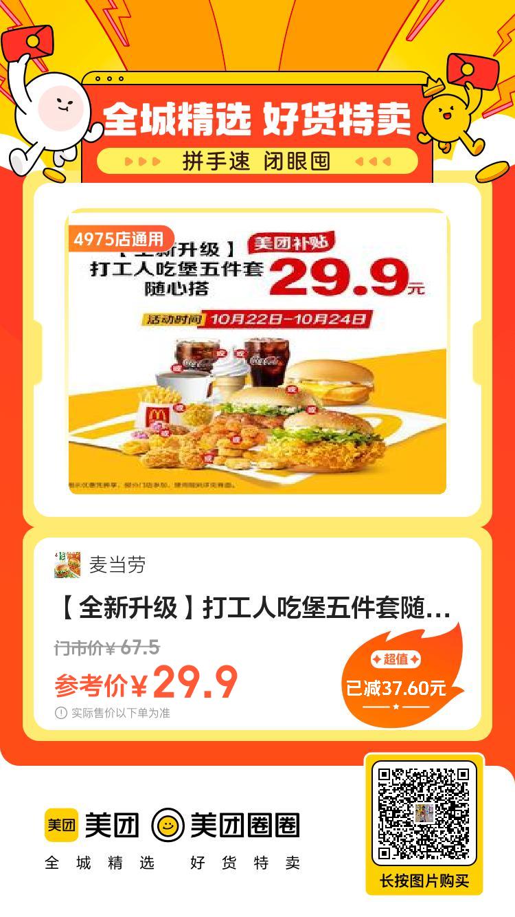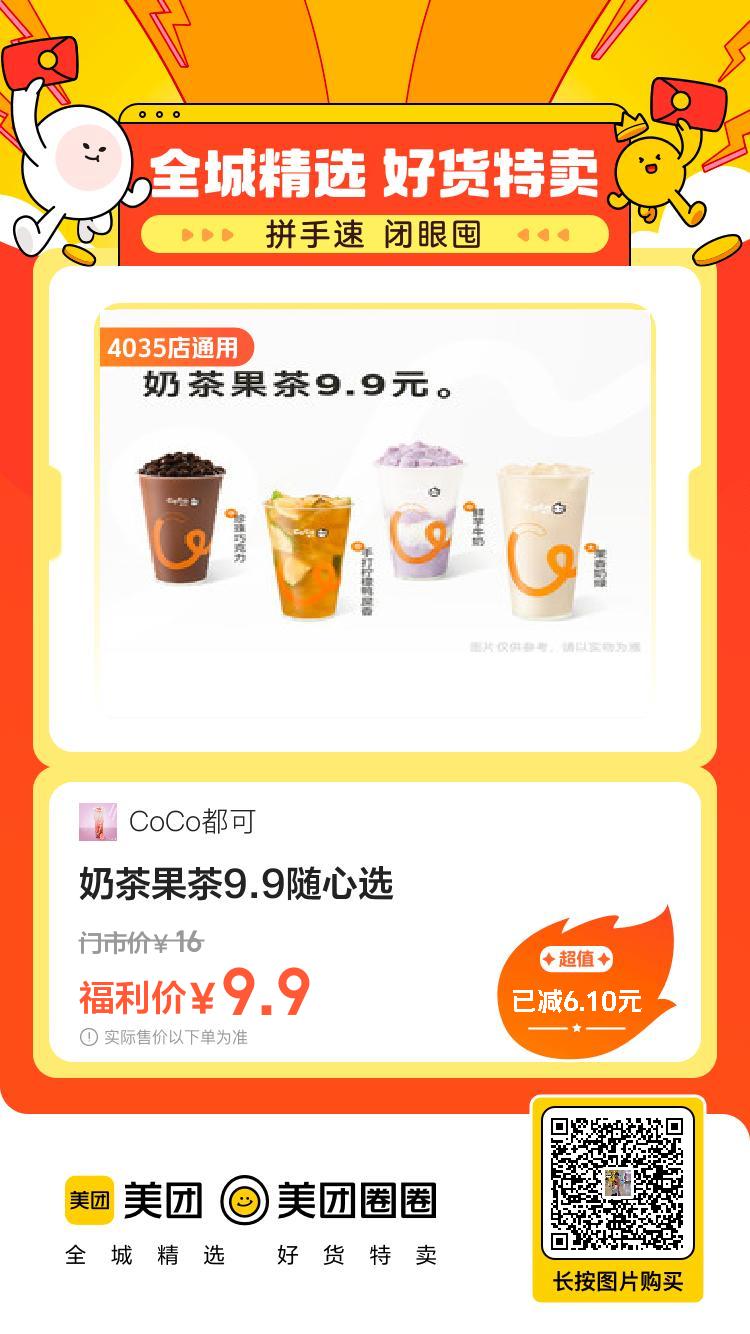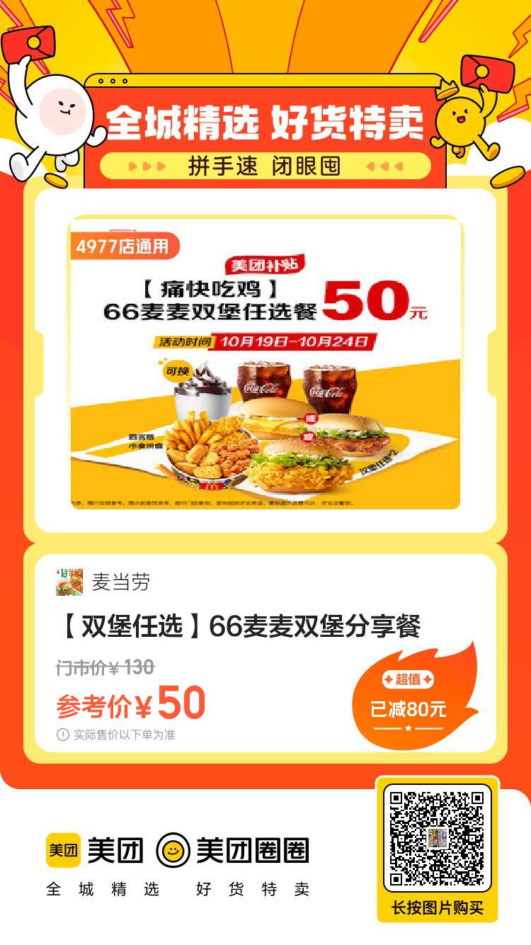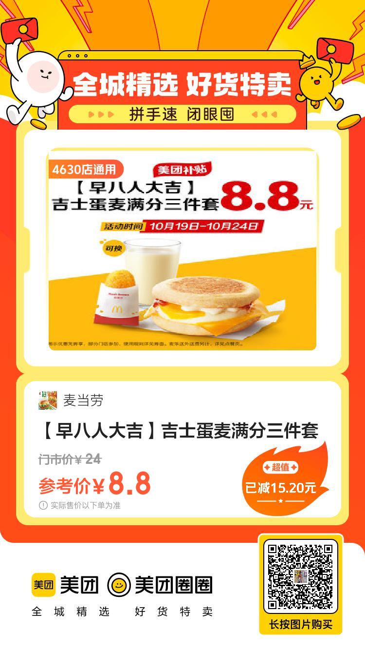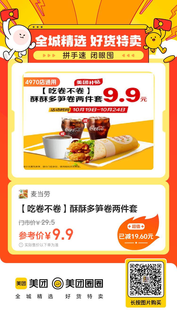 美团到店8.8,麦当劳|【早八人大吉】吉士蛋麦满分三件套9.9,麦当劳|【吃卷不卷】酥酥多笋卷两件29.9,麦当劳|【全新升级】打工人吃堡五件套50,麦当劳|【双堡任选】66麦麦双堡分享餐7.9,茶百道|【9.9任选人气饮品】 5选19.9,CoCo都可|奶茶果茶9.9随心选