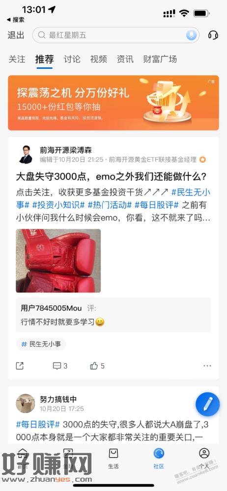 打开交通银行APP,点底部【社区】再点顶部图片【探震荡之机分万份好礼】进去,下拉页面完成3个简单的任务可以抽奖3次