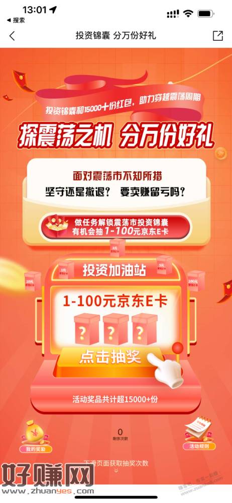 交通银行探震荡之机抽1-100元京东卡 3次机会