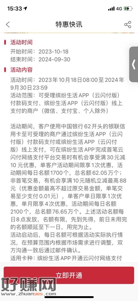 有中行卡的,用中行缤纷生活app被扫码,满30元立减10,必
