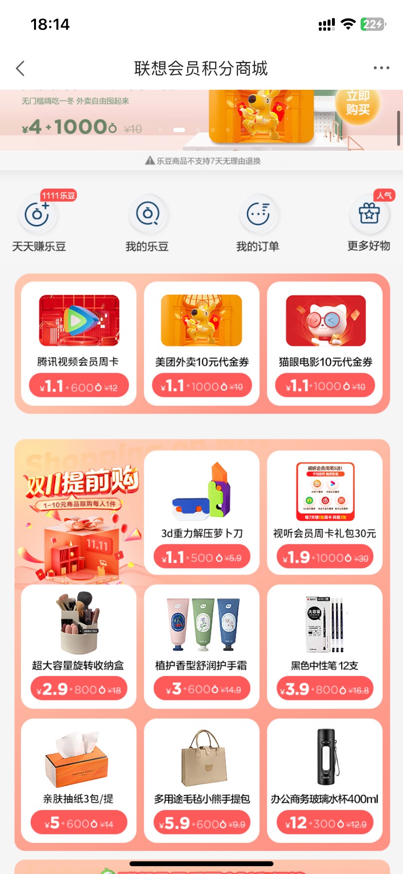 联想智选,1.1买 10美团或者腾讯视频周卡