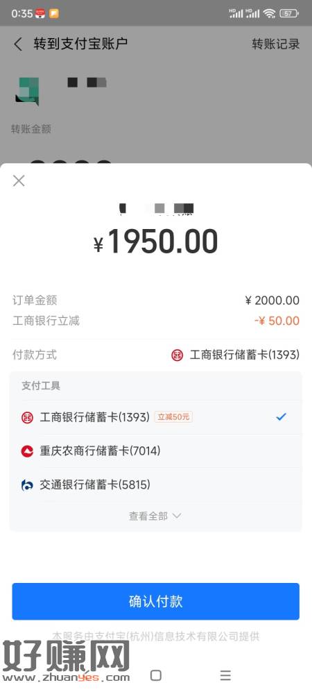 Zfb工行卡有优惠,2000-50,直接转账。福建工行卡有优