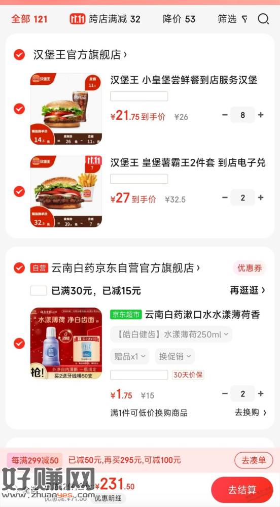 买两个,然后汉堡王凑299-50,1.75一件,便宜的要命,需要6-5券,系统会弹出来